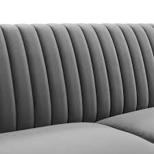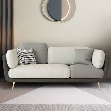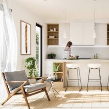 The elegant interior depicted seamlessly blends minimalist charm with cozy sophistication. A monochromatic color palette enhances the room's cohesive feel, anchored by inviting shades of gray on the plush sofa. The textural variety from the throw pillows to the ribbed detail on the sofa adds a tactile dimension, creating an engaging yet tranquil space. The modern kitchen in the backdrop with its clean-lined cabinetry and soft wood tones extends the serene ambiance, while contemporary pendant lighting fixtures add a dash of industrial edge. Natural light floods in through large windows, suggesting an intentional design to bridge indoor comfort with outdoor expansiveness.