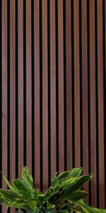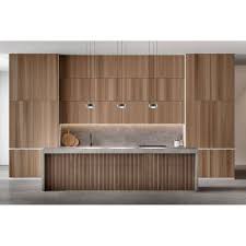 The essence of modern interior design is captured in this serene space, where simplicity and sophistication harmonize. The minimalist approach to design is evident in the smooth, clean lines and a neutral color palette consisting of tans, beiges, and grays that create a sense of calm and spaciousness. Texture plays a key role here; the ribbed wooden detailing on the cabinetry adds depth and a tactile quality that contrasts beautifully against the matte walls. Mid-century modern touches are present in the furniture selection—the sleek, navy blue sofa with tailored lines, along with the wooden, splayed-leg coffee tables, and the understated yet elegant armchair. The subtly-patterned rug anchors the seating area, while lush greenery introduces vibrancy and a connection to the outdoors.